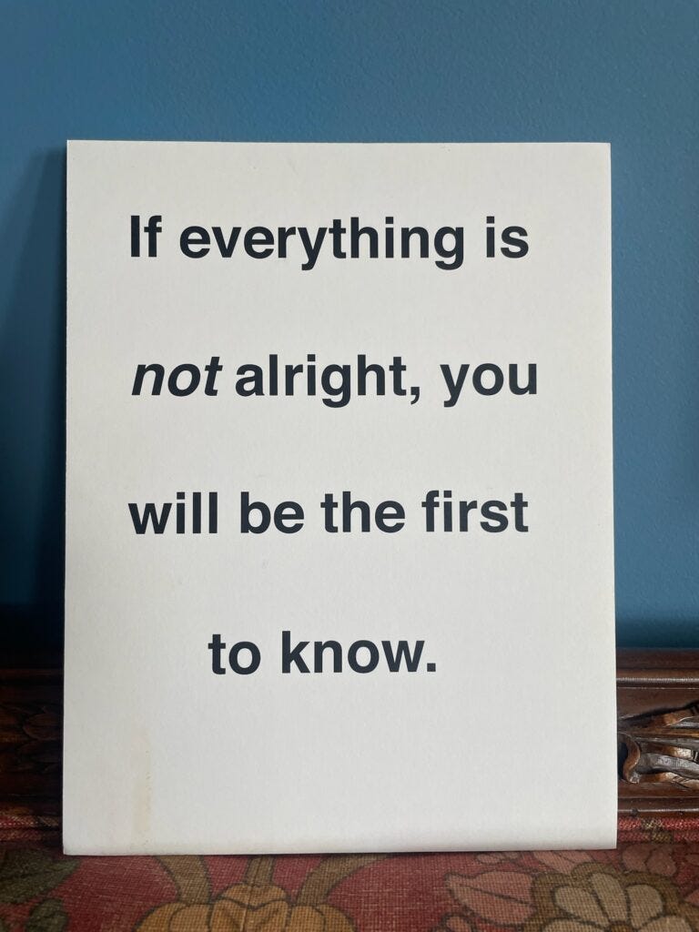 A number of years ago I made a sign for myself that I carried to restaurants whose service seemed too intrusive for me. I put it up after my server came more than two times to my table and stood there waiting until I gave up my conversation so that she or he could interrupt us simply to ask, “Is everything alright?”
